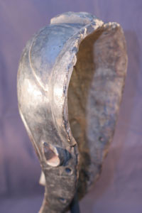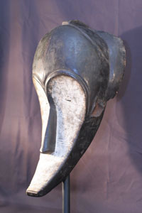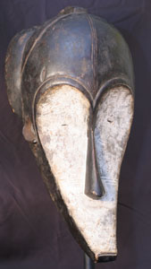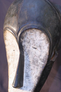 Highly stylized mask elongated features white kaolin pigmented finished aged surface